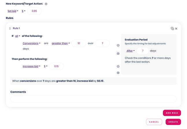 💡 Tip: Use descriptive naming (e.g., “High ACOS Bid Decrease Rule”) to easily identify rule behavior later.